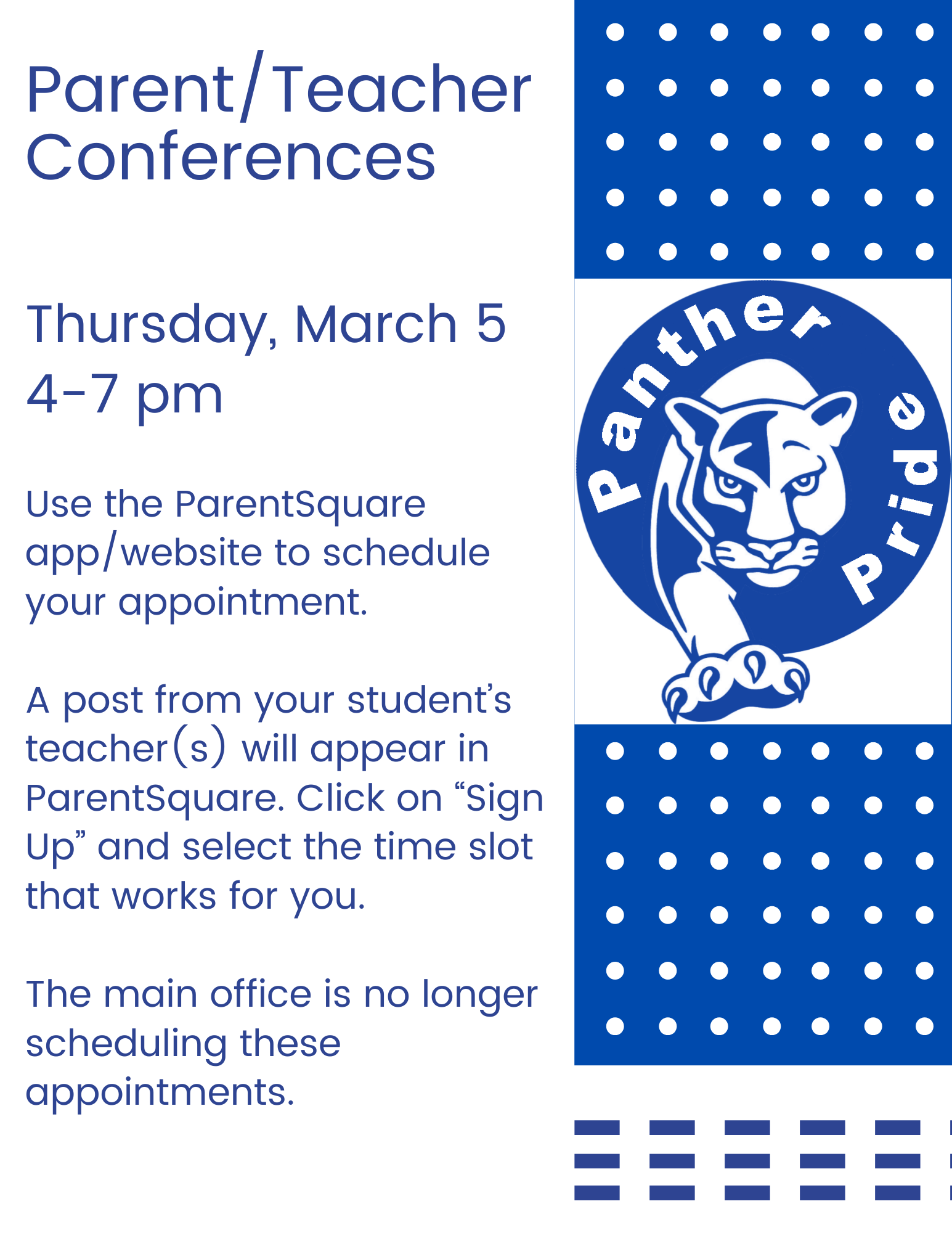 Parent Teacher Conferences - Thursday, March 54-7 pm15 minute incrementsSign up in ParentSquare