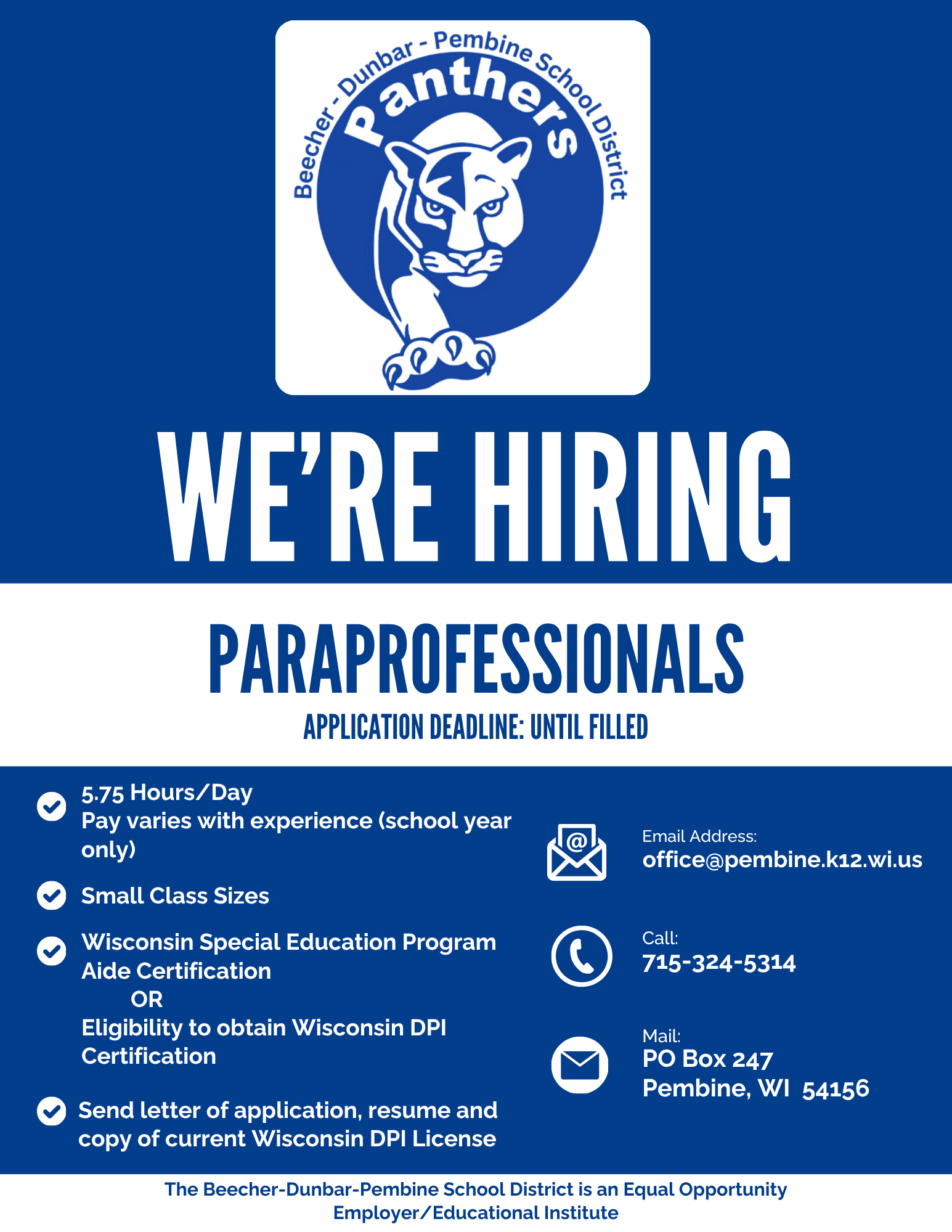 At Beecher-Dunbar-Pembine School District, we prioritize innovative teaching methods, a rigorous curriculum, and a commitment to equity, ensuring that all students have the resources and opportunities they need to succeed. We believe in the power of collaboration between our educators, families, and the community to create a supportive network that inspires lifelong learning and prepares our students to thrive in a dynamic and ever-changing world.